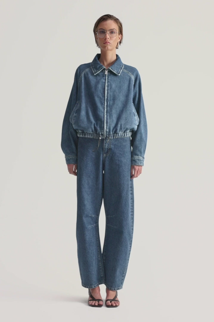 A casual wardrobe staple, the Addison Denim Jacket is a nod to streetwear trends. Constructed from premium denim, this jacket is cut to a relaxed fit with a cropped, elastic waistband. Highlight its versatiliy by combining it with a flowing skirt or structured tailoring. Perfectly suited for seasonal transitions.
